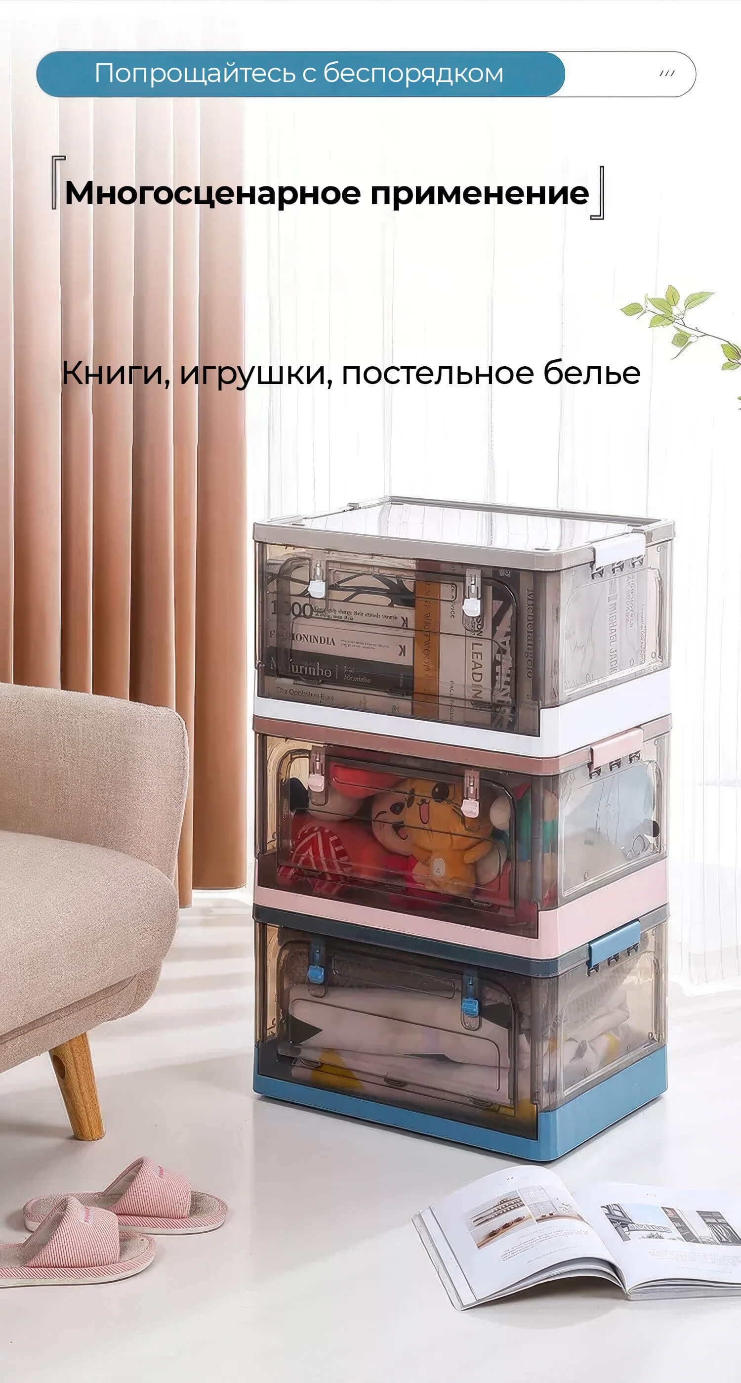 Пластиковая коробка с крышкой защищает вещи от пыли и влаги, обеспечивая чистоту и порядок. Прочная конструкция гарантирует долговечность, а складной механизм позволяет экономить место, когда контейнер не используется.